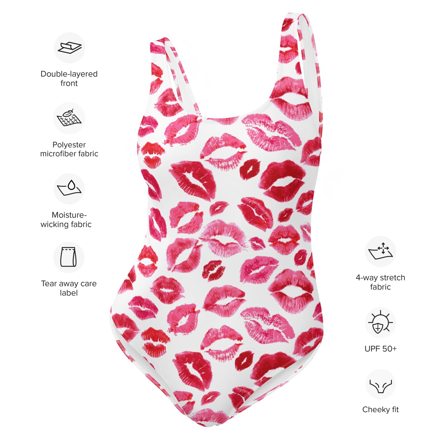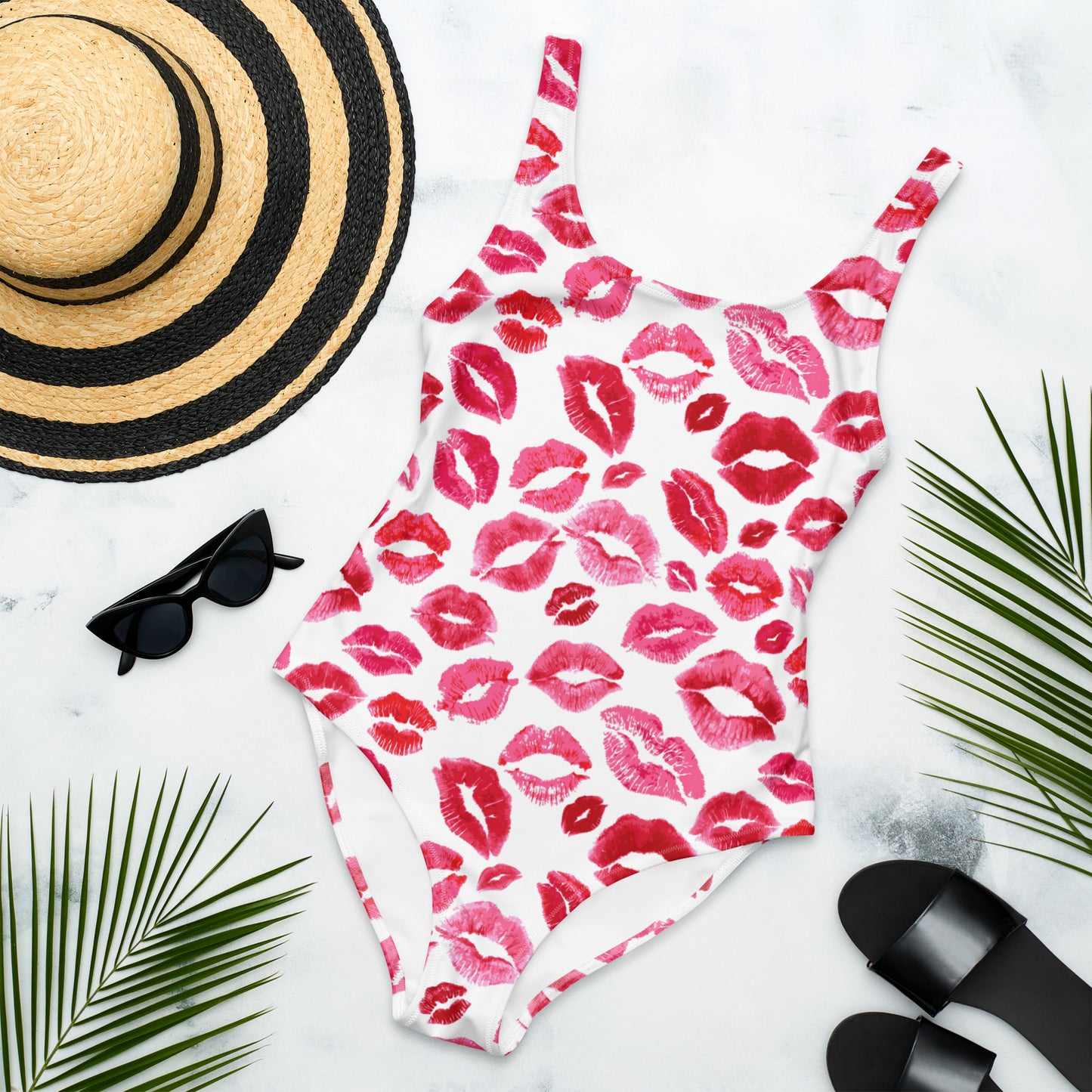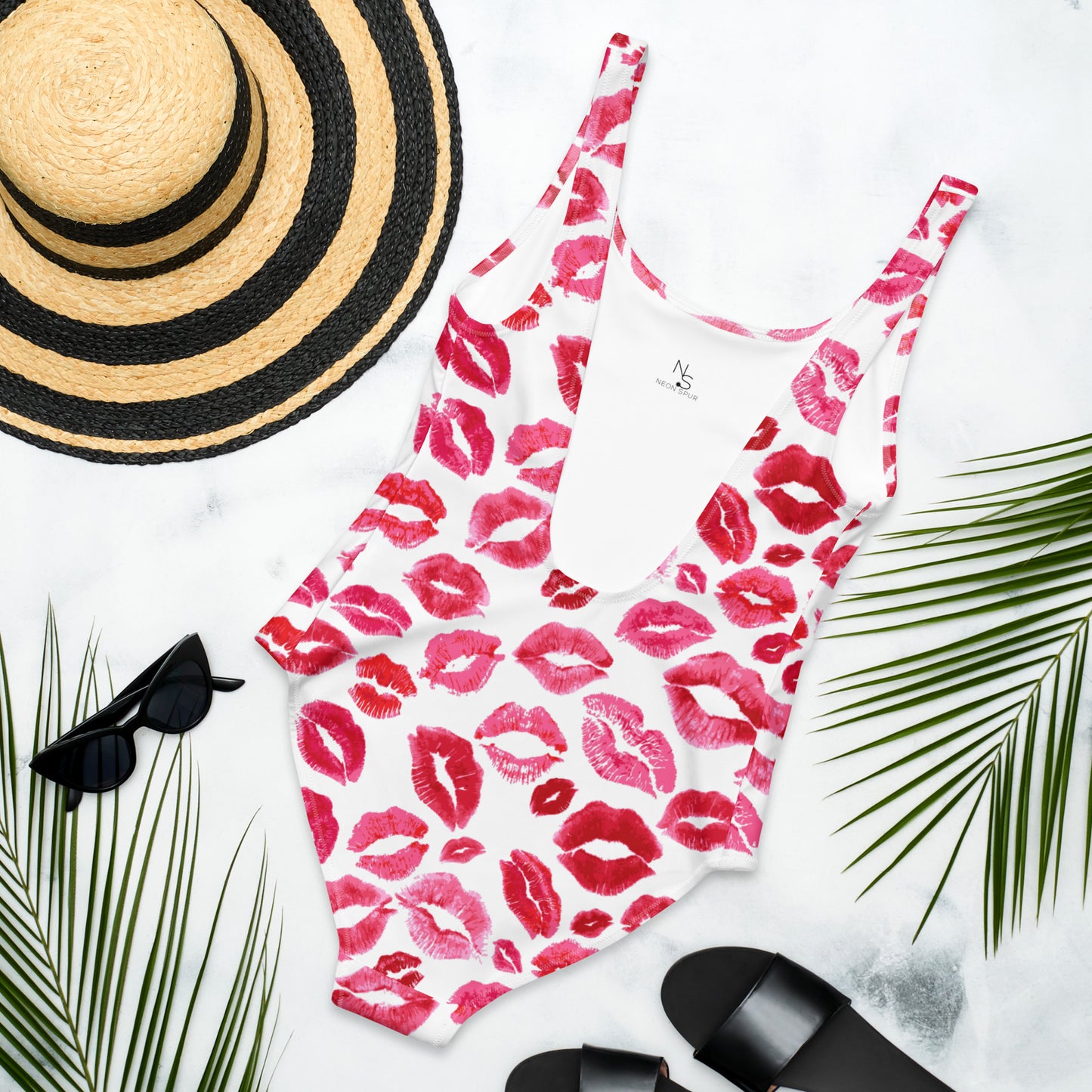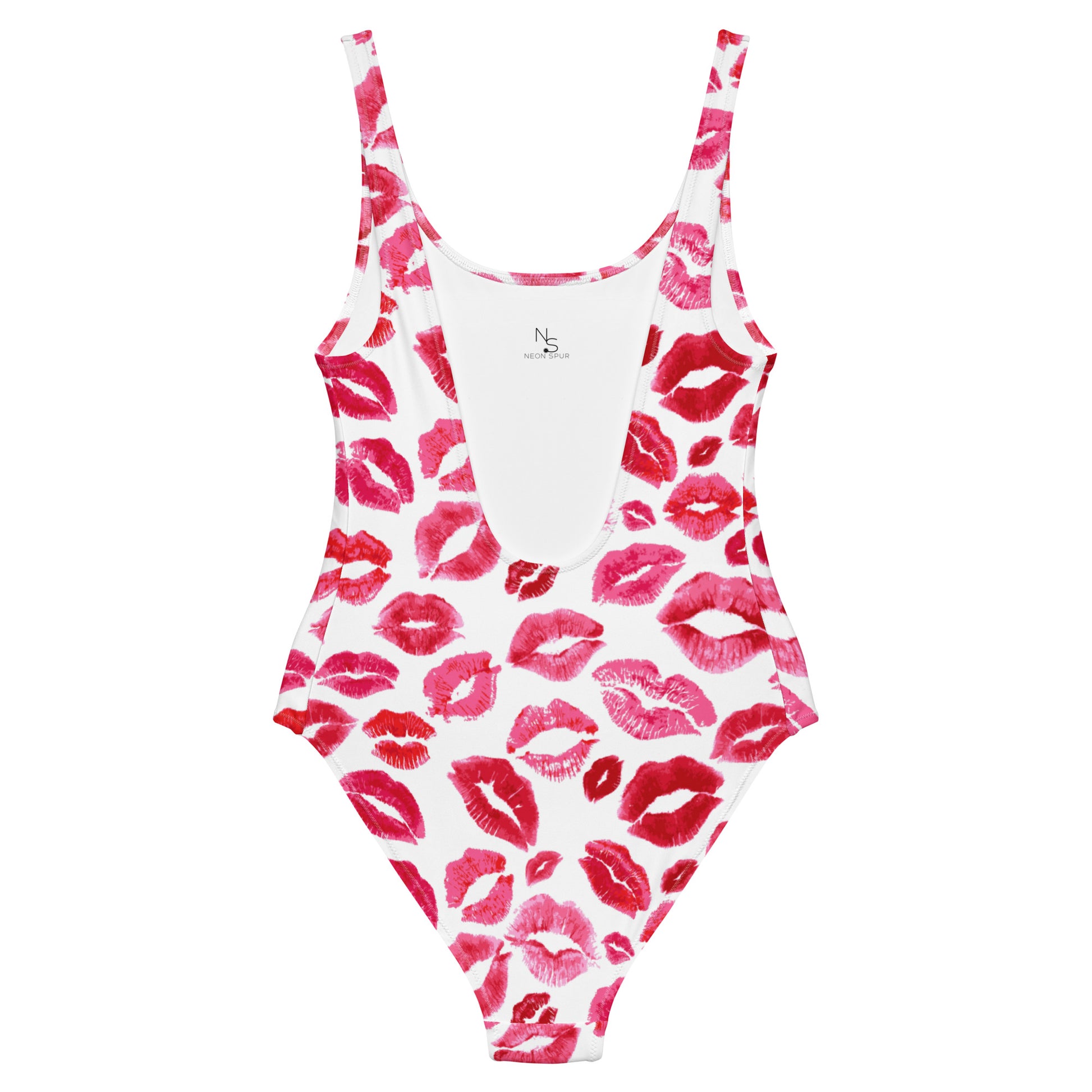 This ain’t your average swim getup—it’s a cheeky little number that’s fixin’ to turn heads from the ranch pond to the resort pool. With a flirty all-over kiss print, the *Smooch & Spur* One-Piece is made for the cowgirl who plays hard and lounges harder.
